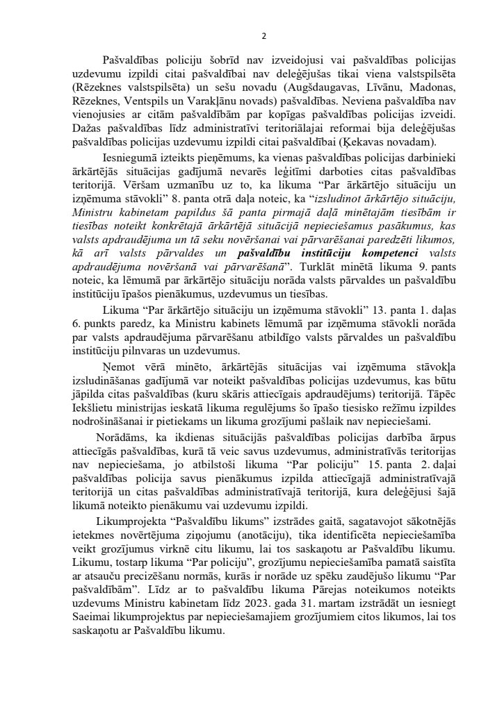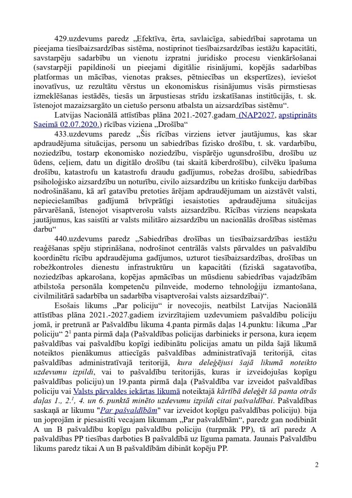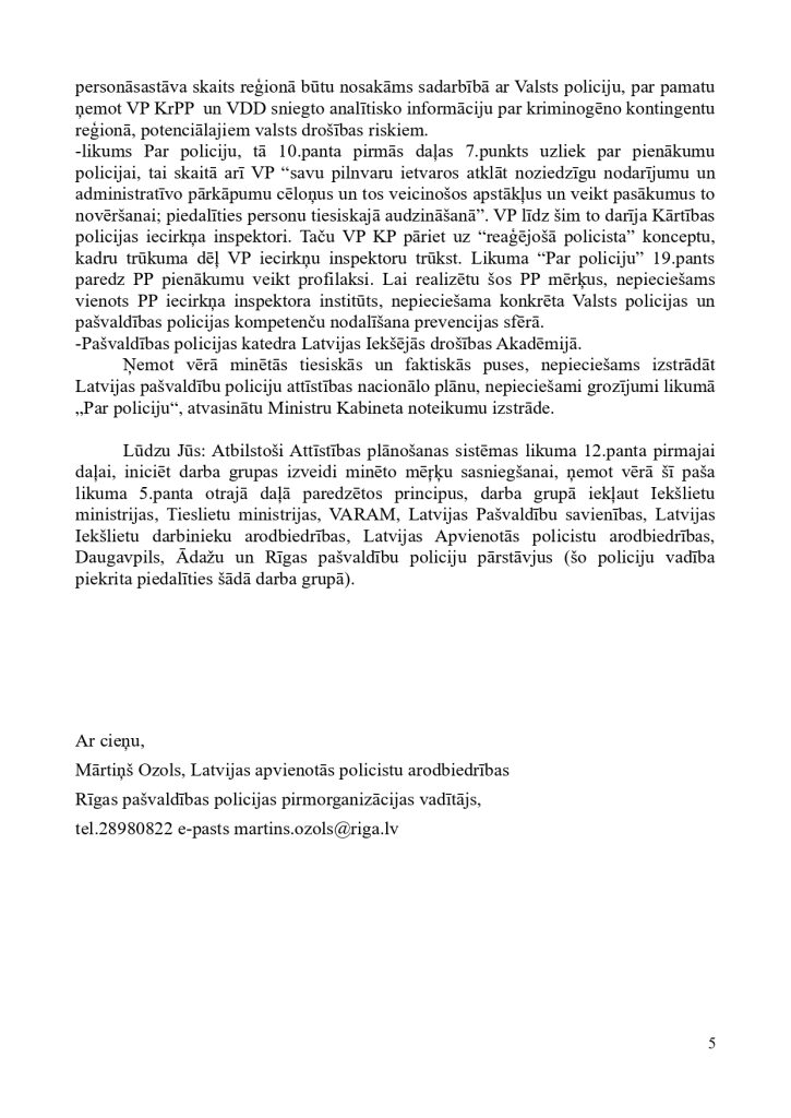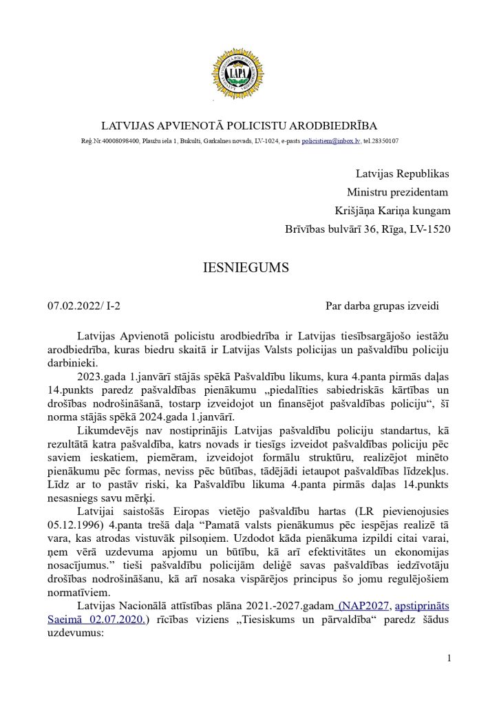 ņem vērā uzdevuma apjomu un būtību, kā arī efektivitātes un ekonomijas nosacījumus.” tieši pašvaldību policijām deliģē savas pašvaldības iedzīvotāju drošības nodrošināšanu, kā arī nosaka vispārējos principus šo jomu regulējošiem normatīviem. Mūsdienu ģeopolitisko un reģionālo risku veiksmīgai reducēšanai ir nepieciešamas spēcīgas pašvaldību policijas. Lai to nodrošinātu 2022.gadā, vērsāmies pie Ministru Prezidenta K.Kariņa kunga ar šo iesniegumu: