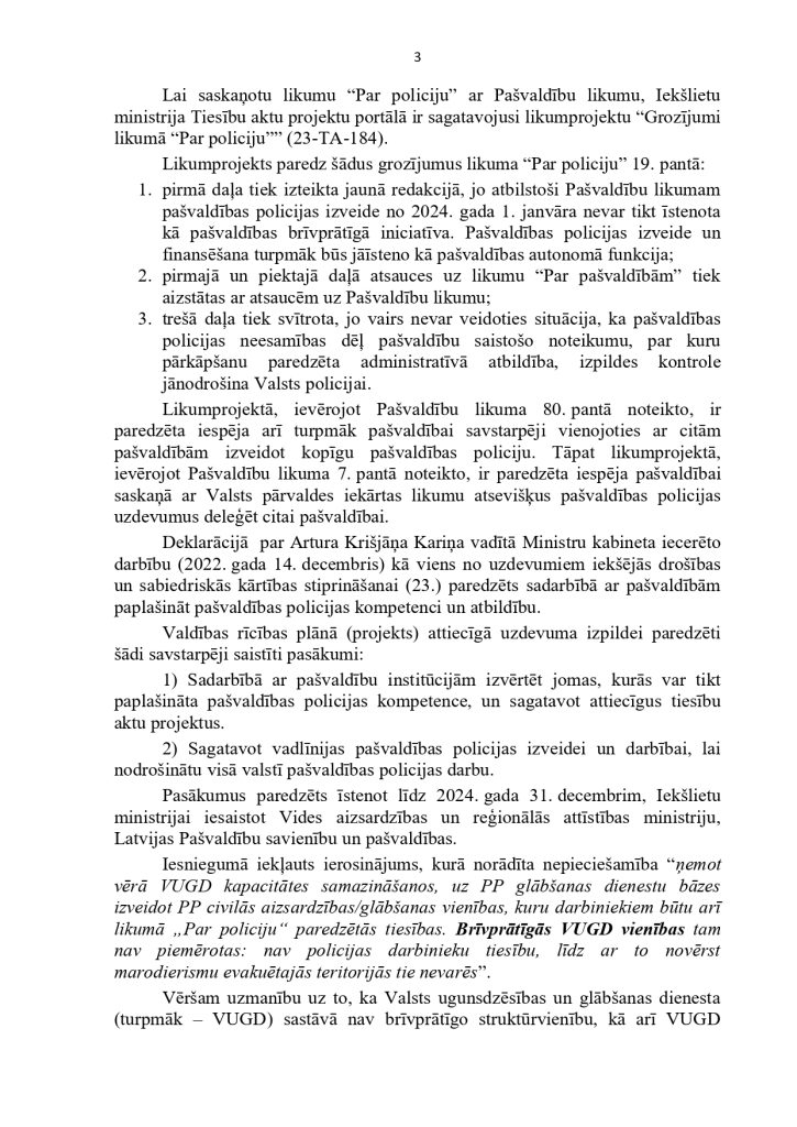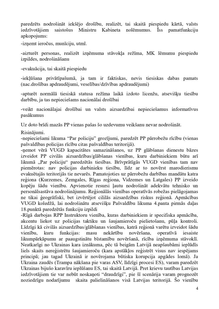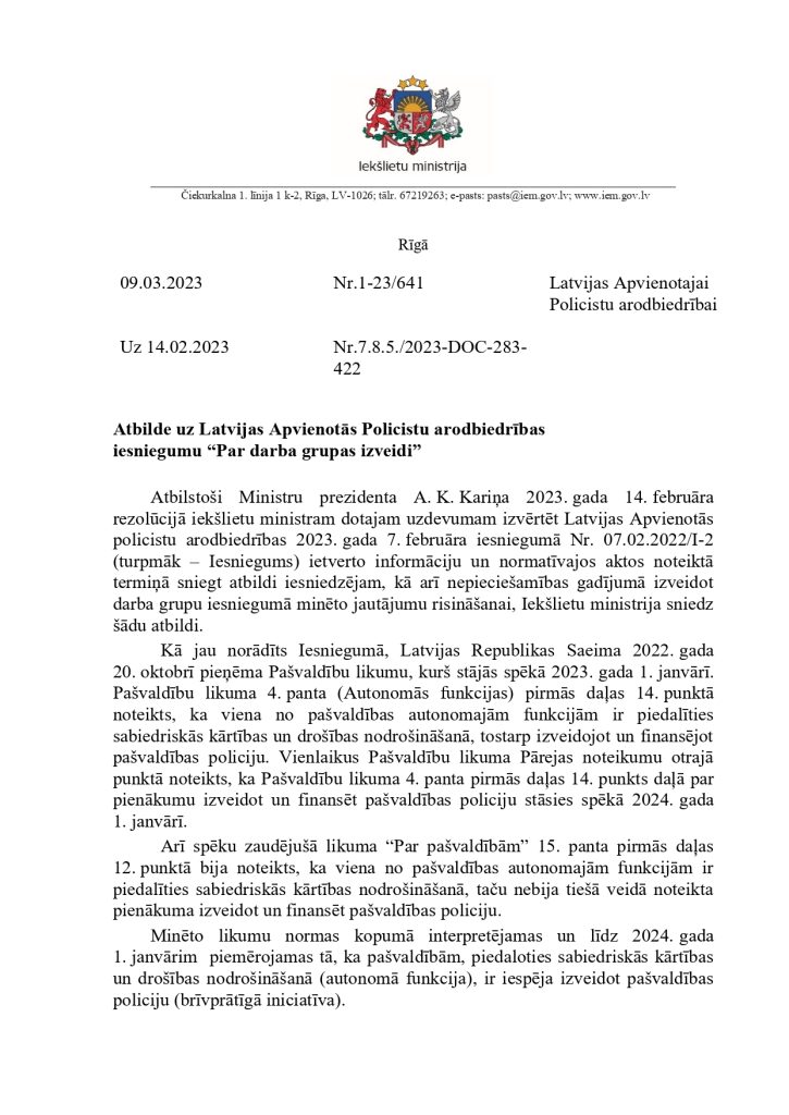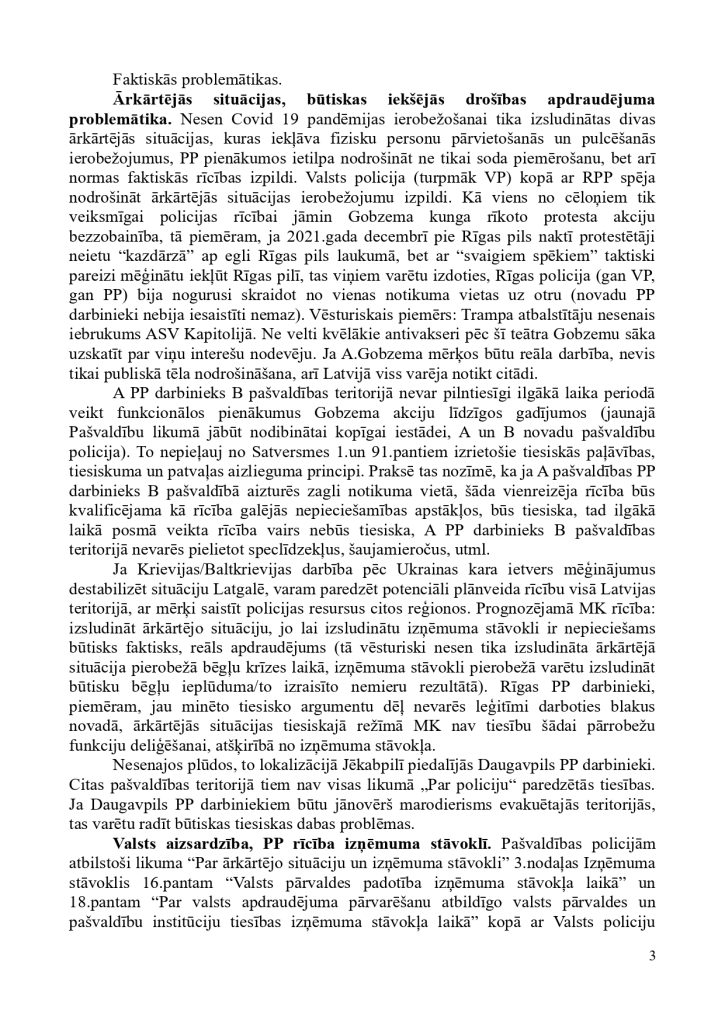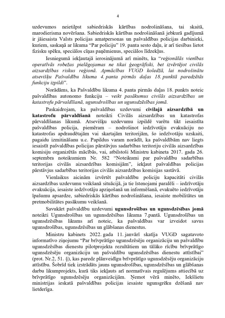 ņem vērā uzdevuma apjomu un būtību, kā arī efektivitātes un ekonomijas nosacījumus.” tieši pašvaldību policijām deliģē savas pašvaldības iedzīvotāju drošības nodrošināšanu, kā arī nosaka vispārējos principus šo jomu regulējošiem normatīviem. Mūsdienu ģeopolitisko un reģionālo risku veiksmīgai reducēšanai ir nepieciešamas spēcīgas pašvaldību policijas. Lai to nodrošinātu 2022.gadā, vērsāmies pie Ministru Prezidenta K.Kariņa kunga ar šo iesniegumu: